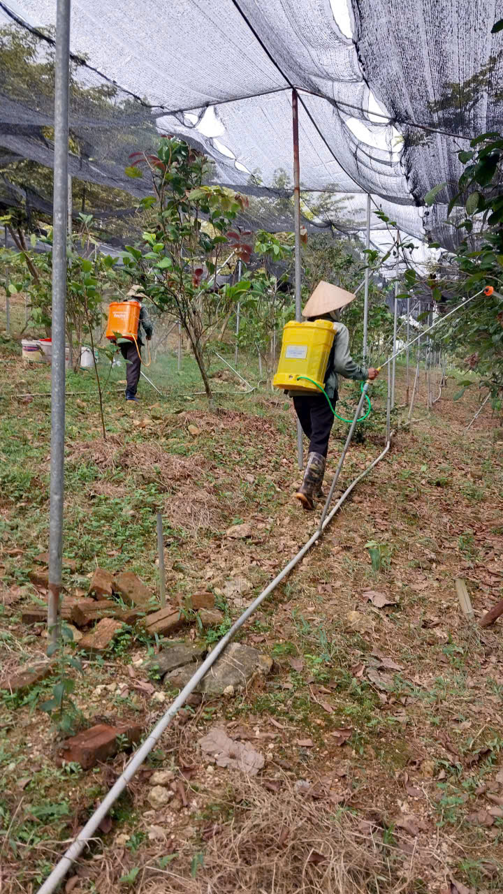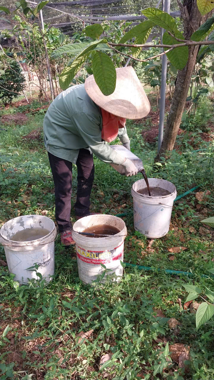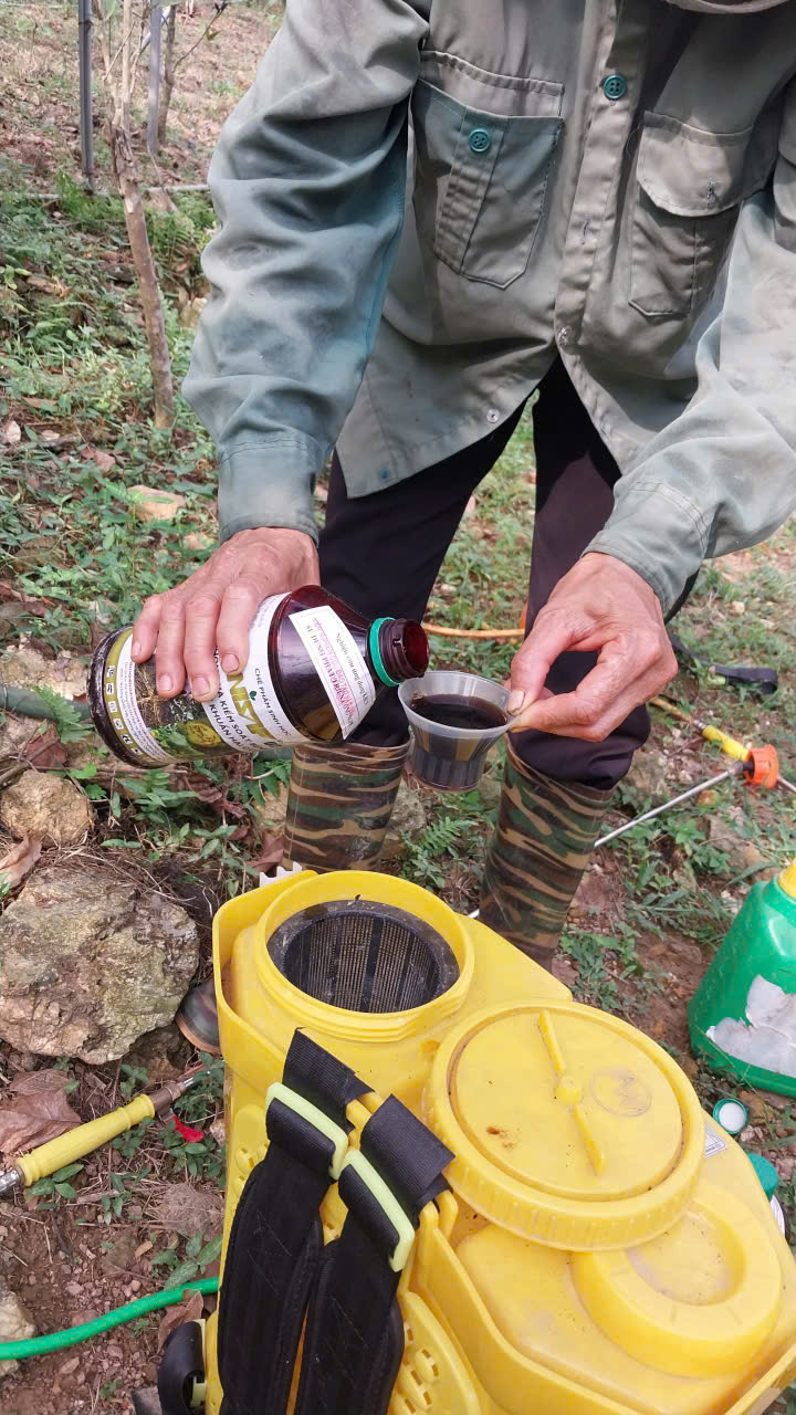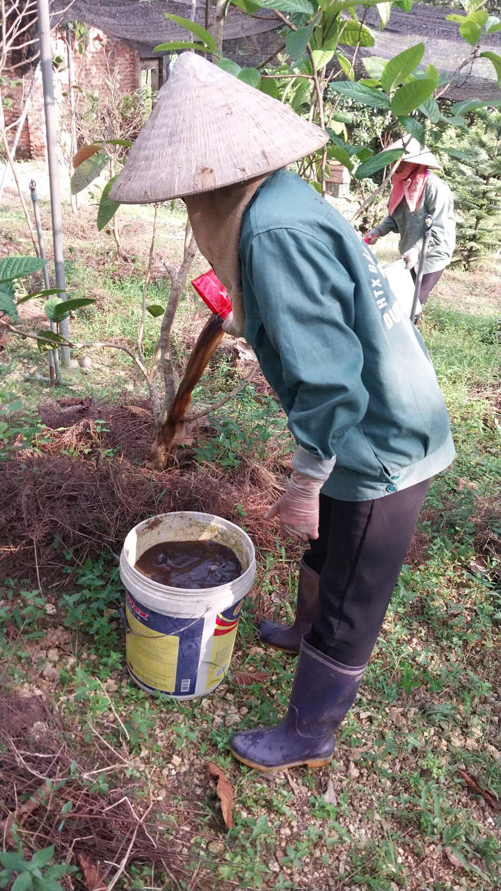 95 | Bón Thúc - Tiến hành bón phân cho cây Trà Hoa Vàng. Sử dụng phân hữu cơ LUCAVI dạng dung dịch - Lượng bón: • Cây nhỏ: tưới 100ml dung dịch phân bón • Cây nhỡ: tưới 150ml dung dịch phân bón - Cách bón: Tưới gốc quanh gốc trà bằng dung dịch phân bón đậm đặc, sau đó tưới nước để phân ngấm dần vào đất. Tổng dung lượng bón cho toàn bộ vườn trà là 120 lít dung dịch Lucavi. |