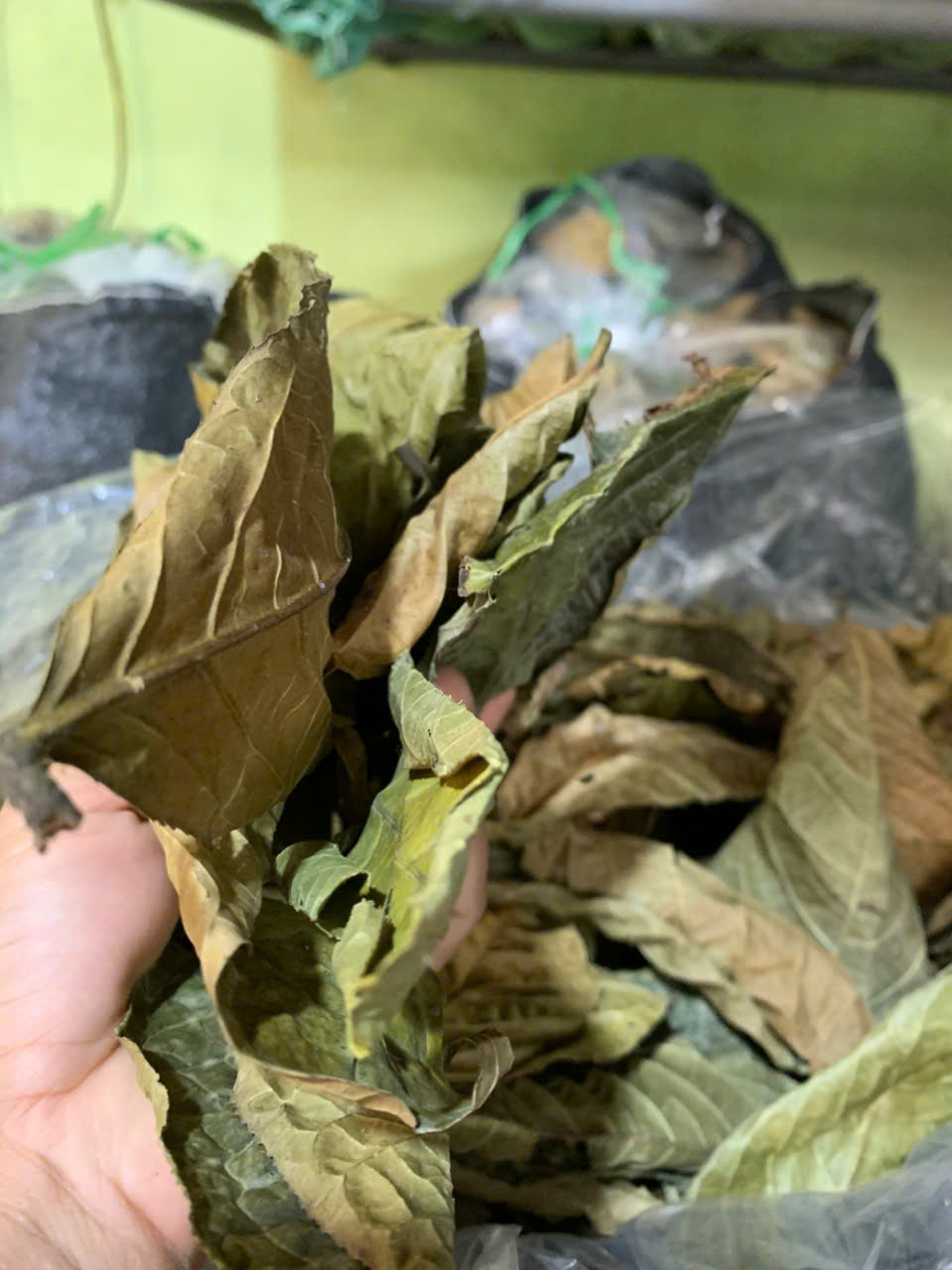 11 | Nhà kho bảo quản - Nhập kho tổng khối lượng thu hoạch lá Trà hoa vàng sau các đợt thu hoạch là: 19 (Kg). Lá trà được đóng trong bao nilon trong suốt và đựng trong bao tải dứa rồi xếp lên giá riêng biệt trong kho chứa dược liệu. |