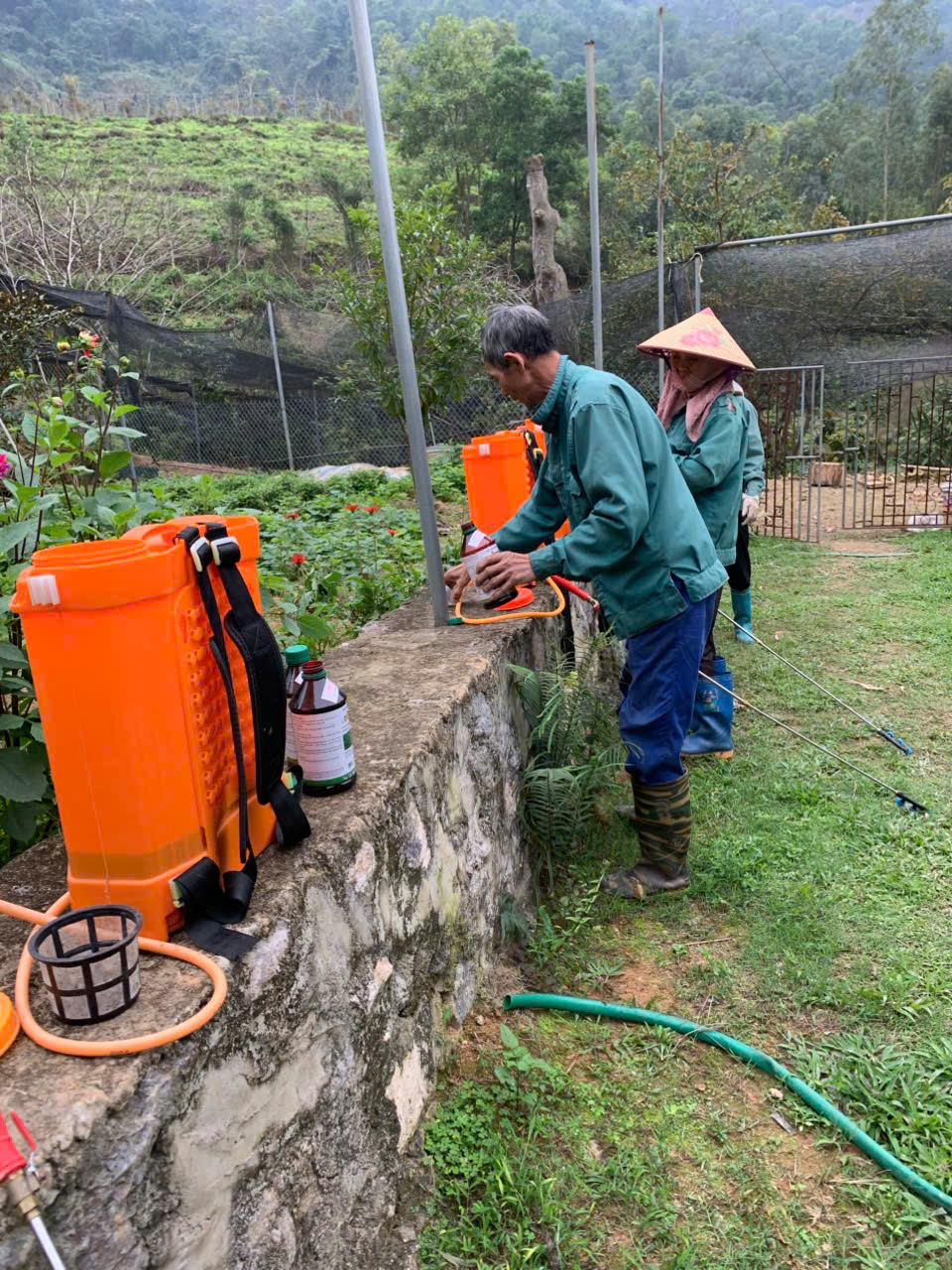 26-08-2024 12:08:00 Bảo vệ thực vật Tiến hành phun chế phẩm sinh học Ani saf 01, 02 và 03 để phòng trừ các loại sâu hại, các bệnh về nấm và virus gây ra cho cây. Cách dùng: pha tỉ lệ 200ml mỗi loại chế phẩm /20 lít nước phun cho toàn bộ vườn Hoàn thành