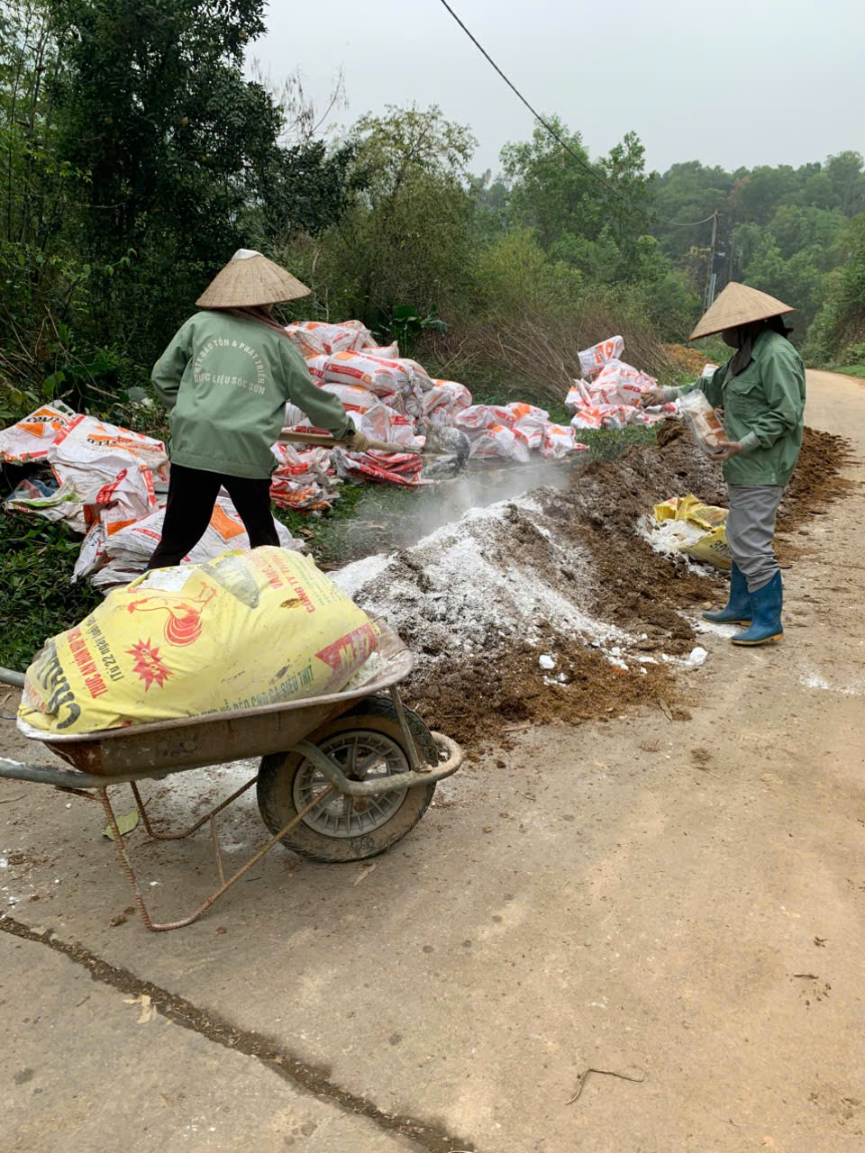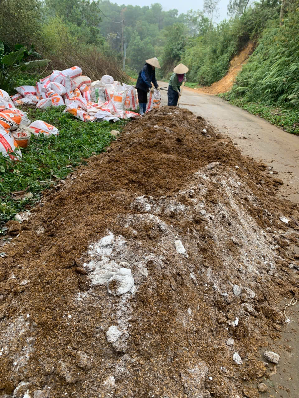 18-02-2025 12:02:00 Thao tác kỹ thuật Tiến hành ủ phân sử dụng tại khu 1. Nguyên liệu gồm 2.1 tấn phân gà được thu gom từ các hộ chăn nuôi xung quanh, 45kg vôi, 5kg chế phẩm men vi sinh ủ "Kiến vàng". Thực hiện trộn đều phân và vôi với nhau, sau đó cứ rải một lớp phân rồi lại rải một lớp chế phẩm vi sinh Kiến vàng. Tưới nước cho đống ủ sao cho độ ẩm đạt 50%. Dùng bạt, bao rứa để đậy kín để giữ nhiệt và độ ẩm. Sau khoảng 15 - 20 ngày tiến hành kiểm tra, đảo trộn nếu cần và nếu nguyên liệu khô thì bổ sung nước. Dự kiến thời gian ủ từ 45 – 60 ngày. Hoàn thành